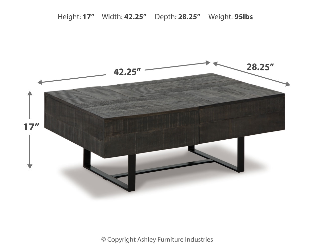 • La mesa de café Kevmart tiene un aspecto de materia mixta que se desliza perfectamente en cualquier escena contemporánea. Su parte superior plana, con un efecto de marca de sierra y esmalte marrón grisáceo, impresiona con su belleza cruda. Una elegante base de black metal proporciona equilibrio visual. Las diapositivas superiores de la mesa se abren para revelar un compartimento grande, otorgándole un almacenamiento sutil y un estilo superior, todo en uno.